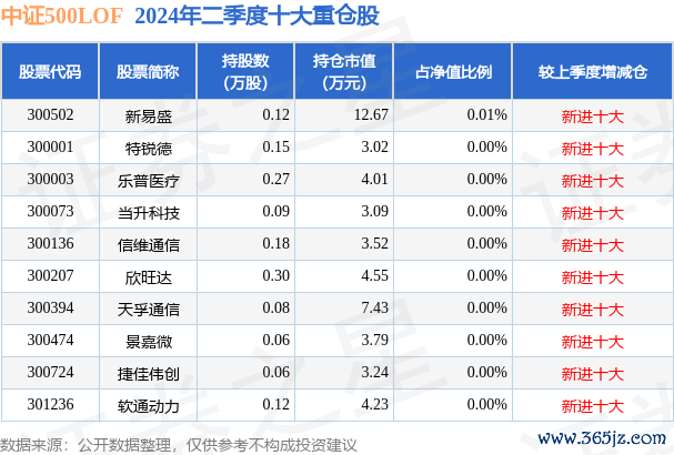 中证500LOF为指数型-股票基金,字据最新一期基金季报泄漏,该基金金钱建立:股票占净值比0.12%,无债券类金钱,现款占净值比7.81%。基金十大重仓股如下: