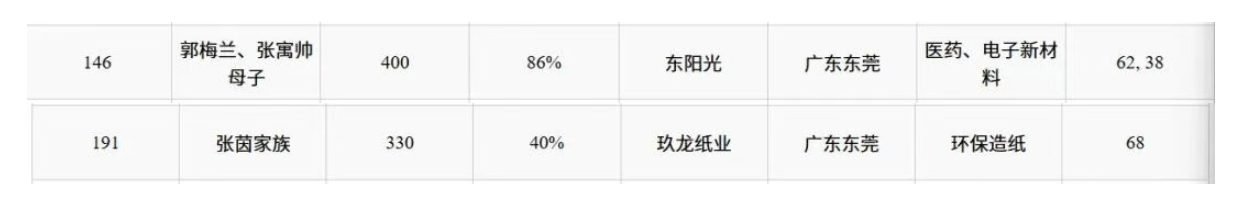 其中,主营医药和电子新材料的东阳光郭梅兰、张寓帅子母以400亿元钞票位居146名;专注环保造纸的玖龙纸业张茵家眷以330亿元位居191名。
