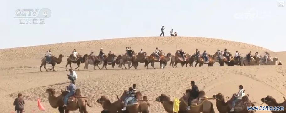 在新疆巴州尉犁县,旅客在塔克拉玛干沙漠中体验骆驼骑行,在塔里木河上打卡拍照,赏玩原始胡杨林。